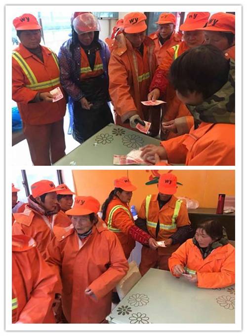 春節(jié)快要到了,他們又想著給孩子們準(zhǔn)備新衣新帽以及過年的年貨。他們的一舉一動(dòng)項(xiàng)目上的保潔工都看在眼里,自發(fā)地與負(fù)責(zé)人商量,想要獻(xiàn)出他們的一份愛心。于是出現(xiàn)了開頭的捐款現(xiàn)場(chǎng)。雖然他們的生活也并不富裕,但是他們樸實(shí)的一句話道出了真心:孩子太小了,可憐,能幫多少幫多少。愛心驛站的清冷因?yàn)樗麄冞@一身桔黃色的到來而格外溫暖,著一身桔黃衣服,身上的雨水滴落了一地,黝黑枯瘦的大手捏著紅紅的人民幣,滿是皺紋的臉上散發(fā)著溫暖的光茫。雖然他們從事著最辛苦的工作,收入也是微薄,但從他們的微薄收入中拿出一部分幫助更需要的人,這樣的奉獻(xiàn)精神值得大家敬仰。一份份心意送達(dá)到后,他們又匆匆投入冰冷的風(fēng)雨中堅(jiān)守在各自的崗位,那一抹抹橘黃色溫暖了這個(gè)寒冬。(江蘇萬楊道路保潔部-潘敏)