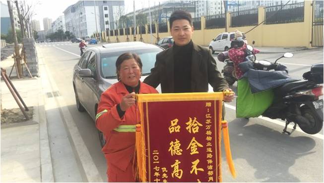 2017年11月20日的揚(yáng)州城氣溫只有2℃,瑟瑟寒風(fēng)中,仇先生滿懷感激之情送來(lái)了一面錦旗。江蘇萬(wàn)楊物業(yè)道路保潔員肖金蘭看著錦旗上“拾金不昧、品德高尚”八個(gè)大字,滿面春風(fēng)。