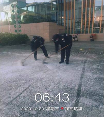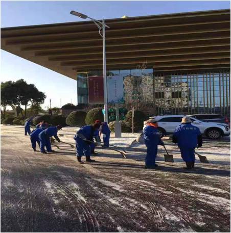當(dāng)天夜里,在崗的物業(yè)保安人員用工業(yè)鹽逐段拋灑會(huì)議中心主干道,確保路面不因低溫而結(jié)冰。30日早7時(shí)未到,項(xiàng)目部全員上路鏟雪,加上萬楊公司運(yùn)作六部派來的8名支援會(huì)議秩序的安保人員,大家繼續(xù)拋灑融雪劑,用鐵鍬鏟的鏟、用大掃把掃的掃……8點(diǎn),會(huì)議中心東廣場已無明顯冰雪存在、京杭之心主干道路面已不再溜滑。不一會(huì)兒,參會(huì)車輛逐步駛?cè)霃V場,與會(huì)人員邁著矯健的步伐走進(jìn)會(huì)場。放下除雪工具的保安人員又開始維護(hù)車輛秩序……