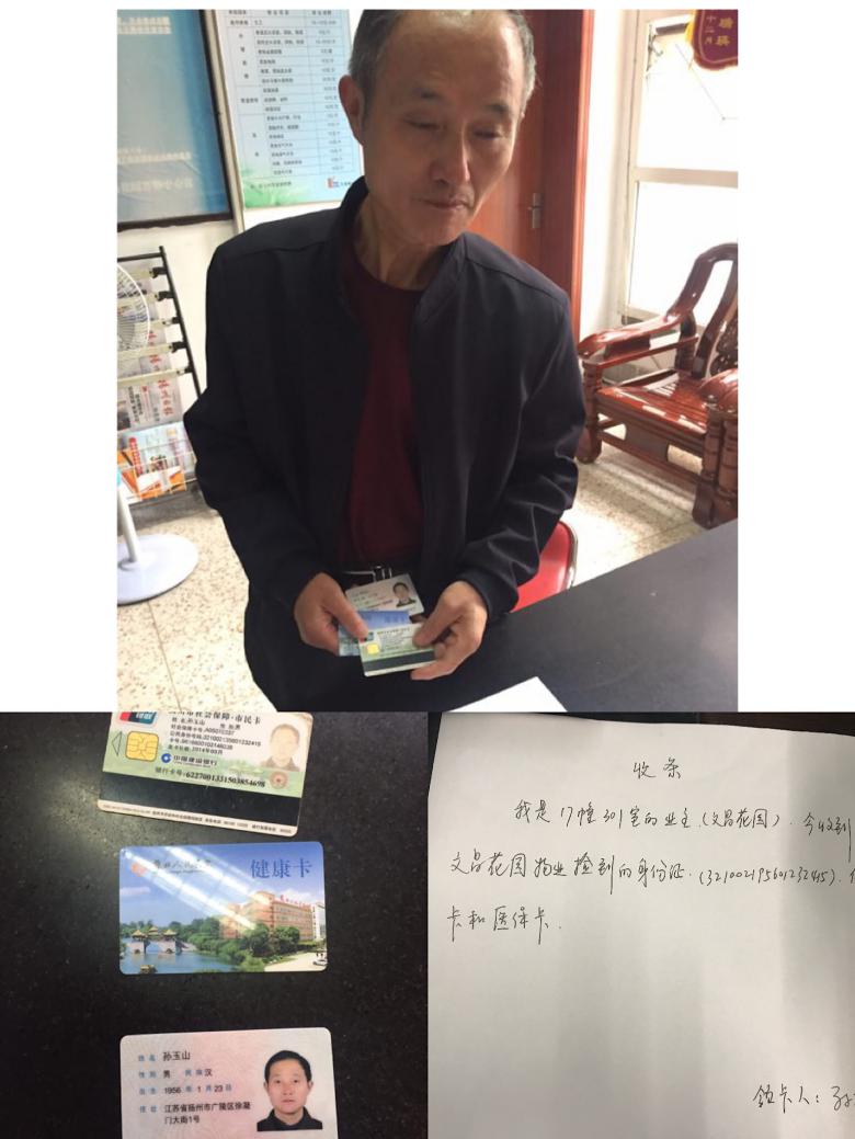 10月9日午9時(shí),萬楊物業(yè)文昌花園小區(qū)保潔班長裔秀華急匆匆地來到物業(yè)辦公室前臺(tái):“麻煩你們找一下,能不能聯(lián)系到這個(gè)人。這是我在19幢前面撿到的3張卡,我在原地等了好久也沒等到失主來尋,這些證件很重要,失主丟了一定很著急!痹瓉硪岚嚅L在自己保潔區(qū)域19幢作業(yè)時(shí)撿到了一張身份證、一張?zhí)K北人民醫(yī)院的健康卡和社會(huì)保障市民卡,在等不到失主的情況下,將卡交到了物業(yè)辦公室。