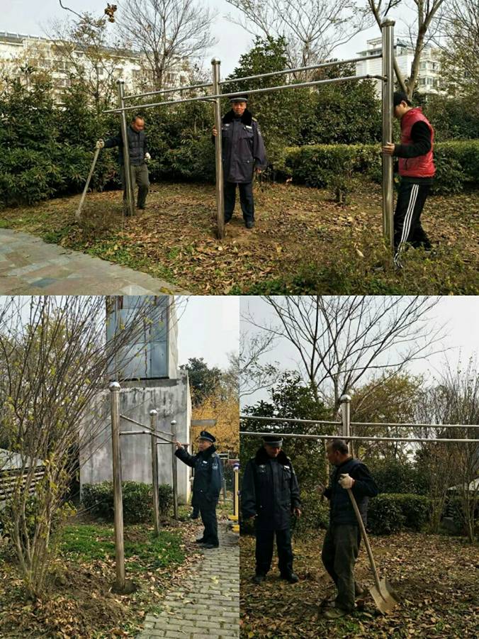 廣陵區(qū)天順花園小區(qū),是灣頭鎮(zhèn)重點拆遷安置居住區(qū),由江蘇萬楊物業(yè)負責(zé)物業(yè)管理服務(wù)工作,由于因拆遷安置的特點,小區(qū)業(yè)主基本從附近村莊農(nóng)民拆遷后安置在此小區(qū)居住,部分年老體弱業(yè)主因不方便上樓居住,而住在自家車庫,但每天的換洗衣服的晾曬就成了問題,特別冬季老人的被褥晾曬,個別業(yè)主選擇在樹上拉繩子晾曬衣服,這一行為在破壞綠化的同時也影響了小區(qū)的整體美觀;同時,對近幾年的文明城創(chuàng)建工作也有很大的影響。江蘇萬楊物業(yè)天順花園項目處針對此情況,積極與社區(qū)和小區(qū)部分志愿者溝通,達成一致意見,為滿足小區(qū)老年業(yè)主的生活需求,規(guī)范小區(qū)管理,物業(yè)公司聯(lián)合社區(qū)在小區(qū)偏僻的空曠地帶采取集中規(guī)劃、樓幢分散定位的方式安裝便民曬衣架,方便老年業(yè)主晾曬衣物及被子。此舉規(guī)避老年業(yè)主亂曬亂掛同時解決了無處曬衣被之苦。