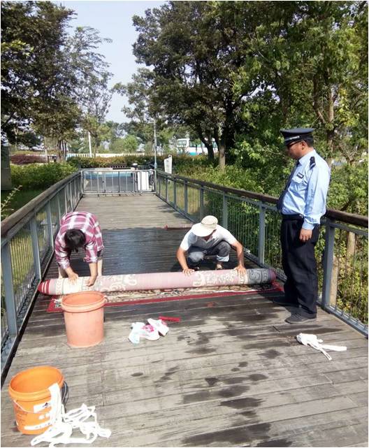 隊員們接報后,快速到達了現(xiàn)場。只見多塊毛毯堆放在橋頭,其中一塊10多平米的地毯幾乎鋪滿了棧橋的整個寬度,一對中年夫婦正手持木刷、掃帚、水桶等工具努力刷洗著地毯上污漬,市民游客想從此棧橋通過已相當困難,另外洗衣粉、洗潔精泡沫沾滿了橋面,并隨著沖洗水流淌入了園區(qū)的觀光河道,污染了水資源。
