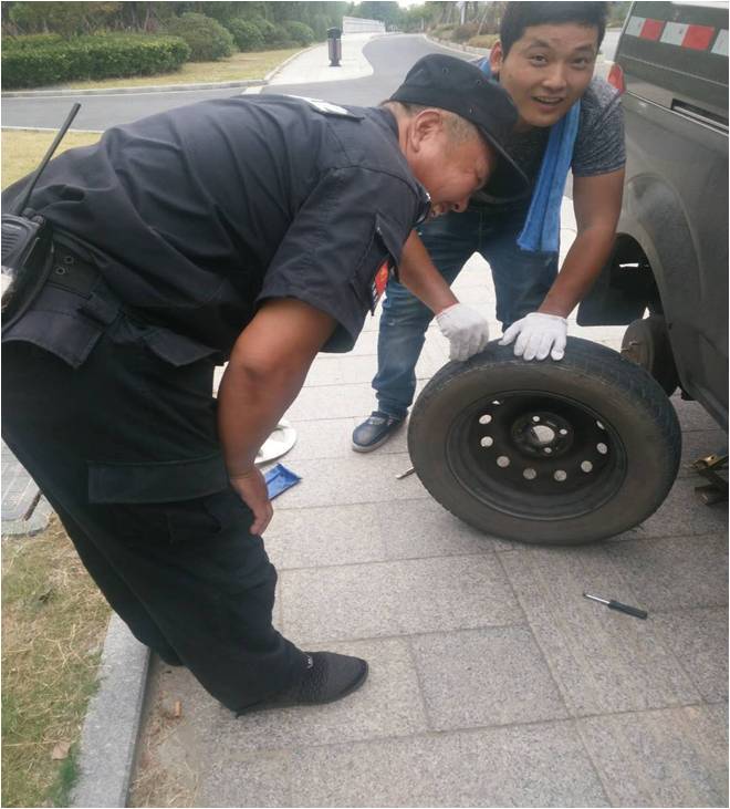 “便民、助民”行動(dòng),江蘇萬(wàn)楊物業(yè)中央公園管理處歷來(lái)都十分的關(guān)注和跟進(jìn)。班長(zhǎng)嚴(yán)長(zhǎng)國(guó)也第一時(shí)間安排車巡隊(duì)員方德元將物業(yè)巡邏車上配備的千斤頂送到了現(xiàn)場(chǎng),并找來(lái)了磚塊墊在千斤頂下?lián)纹鹆嗣姘,車主方先生看見物業(yè)保安助力幫忙,先前的沮喪心情豁然開朗,也熟練的手持工具將爆裂輪胎卸下……