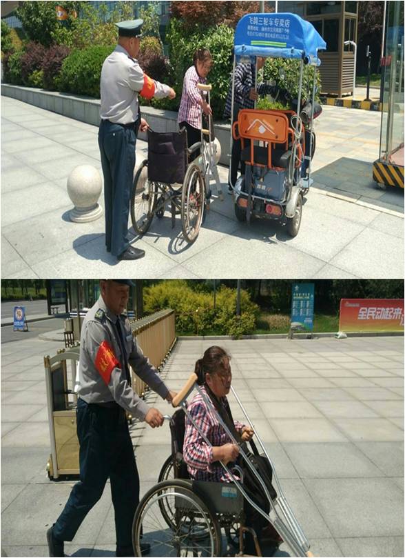 “師傅,幫幫忙,我們要到2號(hào)樓辦點(diǎn)事,讓我把車(chē)開(kāi)進(jìn)去!闭趶V場(chǎng)東崗執(zhí)勤的保安老徐被一輛三輪代步車(chē)車(chē)主叫住。老徐看到車(chē)上有位腿部殘疾的老婦,仍不加思索地回答車(chē)主:“為了便于管理,廣場(chǎng)有規(guī)定,任何社會(huì)車(chē)輛不得進(jìn)入!崩闲煺f(shuō)完,又看了看焦急的殘疾老婦,沉思了一會(huì),立即用對(duì)講機(jī)呼來(lái)隊(duì)友,他決定幫助這位殘疾老婦。