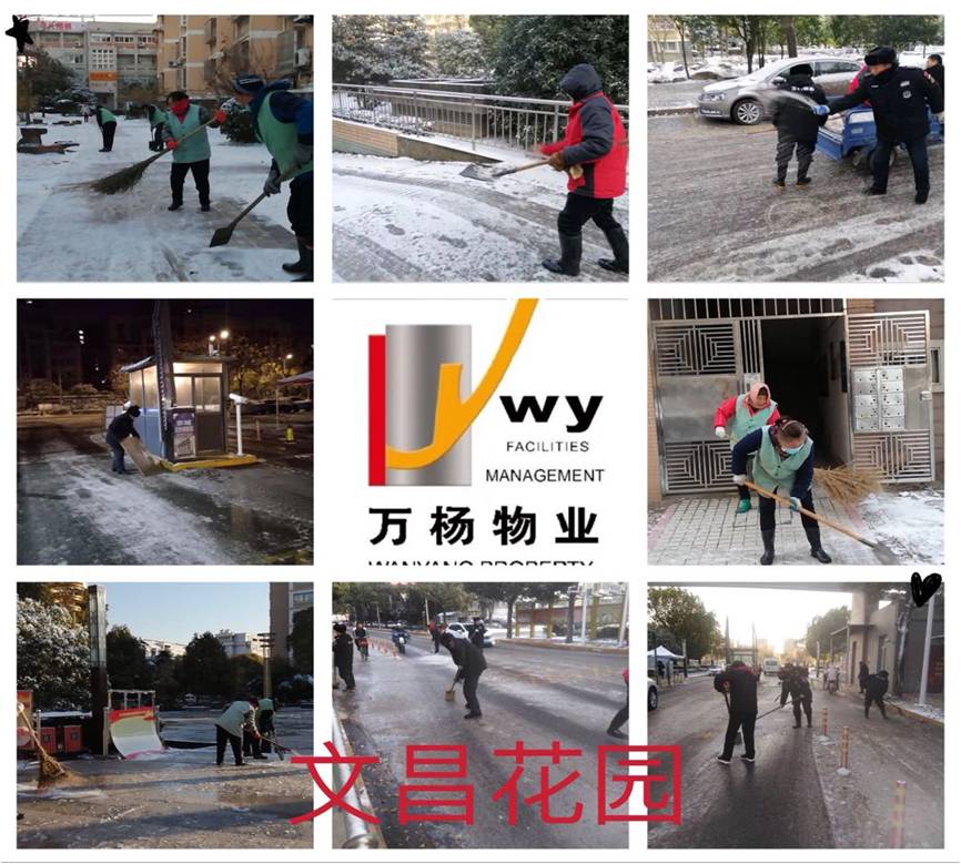 看到寒潮黃色預(yù)警后,項目經(jīng)理張彪根據(jù)小區(qū)實際情況,提前制定了鏟雪除冰應(yīng)急預(yù)案,并召開除雪會議,部署了工作,規(guī)劃好人員。當(dāng)大雪如約而至后,根據(jù)會議中的安排,數(shù)十名門崗人員首先將5個門崗周圍的積雪清除掉,部分人員向主干道的路面和2個人防的進(jìn)出口撒鹽,同時保潔部的23個員工負(fù)責(zé)各自工作區(qū)域支干道及單元樓門口的積雪鏟除。3名前臺和4名工程人員負(fù)責(zé)清理中心廣場四周延伸至主干道。朦朧的燈光下隨處可見物業(yè)人員忙碌的身影。所有員工有條不紊的清掃著,用實際行動給居民帶去“溫暖”,讓居民們更加深刻感受到萬楊公司的“精心管理、全心服務(wù)”的服務(wù)理念。