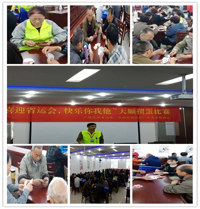 為迎接省運會的到來,同時為了豐富小區(qū)業(yè)主業(yè)余文化生活,調動廣大業(yè)主參加集體活動的積極性,增進社區(qū)、物業(yè)公司和業(yè)主之間和諧、互動、學習交流, 2018年5月26日,由揚州市廣陵體育總會,天順花園社區(qū)和江蘇萬楊物業(yè)天順花園項目處共同舉辦的摜蛋比賽活動在天順花園社區(qū)二樓會議室舉行。