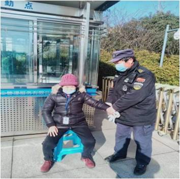 這一幕發(fā)生在城慶廣場西門崗,事發(fā)的起因是當(dāng)時正在崗?fù)ぶ蛋嗟闹刃騿T朱道龍看到一位佝僂身軀行動不便的老太太東張西望,眼里還噙著淚水,在自言自語,于是隊員朱道龍立即上前詢問情況,但因為老人年紀(jì)較大口齒不清自己也不知道怎么就走到了這里。不遠(yuǎn)處就是馬路,為了防止老人發(fā)生意外,朱道龍就將老人攙扶到崗?fù)ぬ幮菹,并遞上溫水安撫老人。