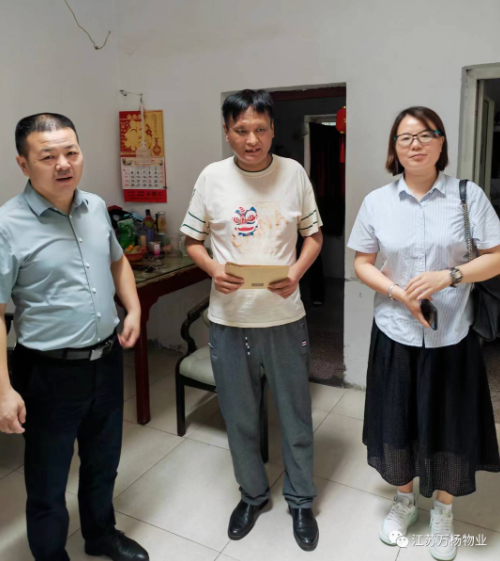 6月26日上午,江蘇萬楊物業(yè)黨支部副書記魯海軍攜同公司工會副主席胡金春一行4人,帶著慰問金來到東花園小區(qū)看望得了尿毒癥的黨員王強同志,為他送上黨組織的關(guān)心與祝福。