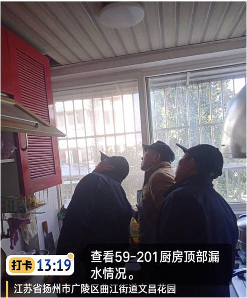 1月14日下午一點多,文昌花園物業(yè)前臺來了一位60多歲的大爺,說家里從昨天晚上開始,廚房間頂上的天花板有水往下滴,請物業(yè)幫忙查一下。聽完59棟201郭大爺?shù)脑V求后,客服居云華趕忙電話聯(lián)系在小區(qū)里維修的工程主管楊福平,隨后楊福平帶著維修工華永道來到201郭大爺家中查看。