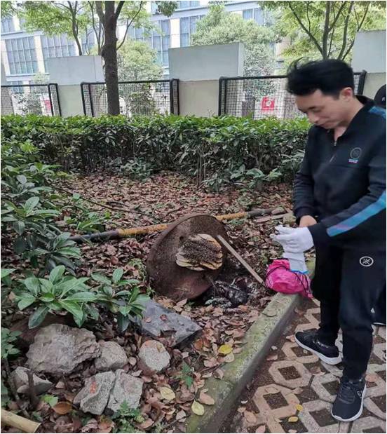 說干就干,徐隊(duì)長當(dāng)即聯(lián)系了養(yǎng)殖蜜蜂的張師傅來到現(xiàn)場,據(jù)介紹,蜜蜂一般不會攻擊人類,了解蜜蜂習(xí)性的張師傅只佩戴了一雙手套,拿個(gè)袋子,小心翼翼的撬開管道井,不到一分鐘的時(shí)間就安全的清理了蜂巢。解除了安全隱患。