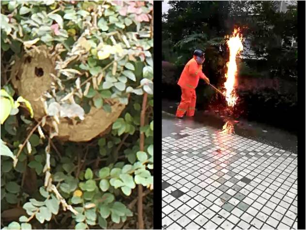 由于文昌花園的樹(shù)木茂盛,綠化環(huán)境好,現(xiàn)又正值秋天馬蜂產(chǎn)卵的季節(jié),若不清除,馬蜂窩會(huì)越來(lái)越大,嚴(yán)重影響到居民們的生活和出行安全。項(xiàng)目部的佘經(jīng)理和工程人員兩次到現(xiàn)場(chǎng)對(duì)蜂窩所處位置和周邊環(huán)境進(jìn)行勘察后,考慮到馬蜂窩體積比較龐大,摘取困難,最終制定了火燒的方法進(jìn)行清除。