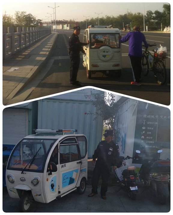 10月2日上午7時(shí)38分,江蘇萬楊物業(yè)中央公園3號崗?fù)ぬ,一輛電動小三輪車緩慢的停在崗?fù)ね,三輪?nèi)車主不時(shí)的向在崗?fù)?nèi)隊(duì)員招手示意。
