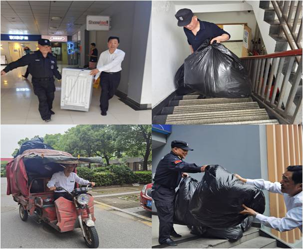 5月17日甲方行政將這一任務(wù)下達(dá),要求在5月25日之前將宿舍全部清空。但是每天白班安保只有6人上班,而且有的崗位的人員還不能動(dòng)。這段時(shí)間,天氣也不給力,經(jīng)常會(huì)下暴雨。人少事重,加上一期和二期宿舍之間還有一段距離,如果全部都靠人來搬運(yùn),在規(guī)定期限內(nèi),任務(wù)是肯定難以完成的。安保隊(duì)長張寶定找來了一輛電動(dòng)三輪車,用三輪車來運(yùn)載貨品。這樣不僅提高了效率也大大節(jié)省了人力。