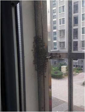 聽完該業(yè)主的講述,物業(yè)人員迅速行動,經(jīng)理助理及秩序維護員攜帶殺蟲劑及手套等工具隨業(yè)主趕往現(xiàn)場。到達現(xiàn)場,我們看到業(yè)主家窗戶外不銹鋼防盜窗插銷處有一小群胡蜂集聚,時不時有一兩只會飛出蜂群,要是蜂群繼續(xù)擴大,導致蟄到人,蟄傷業(yè)主,后果不堪設想。