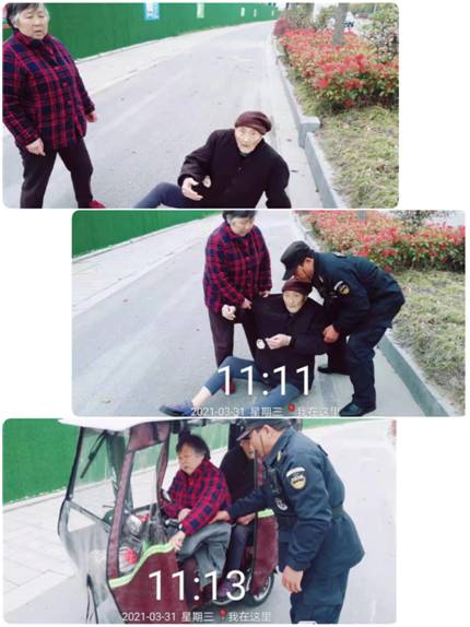 萬楊物業(yè)中央公園車巡崗值日班長董學(xué)虎剛好巡邏至此,看見有人摔倒路邊,立即下車查看;了解得知:摔倒的老人并無大礙,今年已經(jīng)90多歲,家住天順花園105棟,在家悶得慌,正值春暖花開,想出來轉(zhuǎn)轉(zhuǎn)透透空氣,于是70歲的女兒用電動三輪車帶著他。經(jīng)過濱水路中央公園時,老人看到公園景色宜人,興致勃勃的想下車自己活動活動,結(jié)果腿一軟摔倒了在地;由于老人身材高大魁梧,董班長單憑個人力量難以將老人扶起;于是通過無線對講平臺呼叫臨近區(qū)域同事李明俊增援……