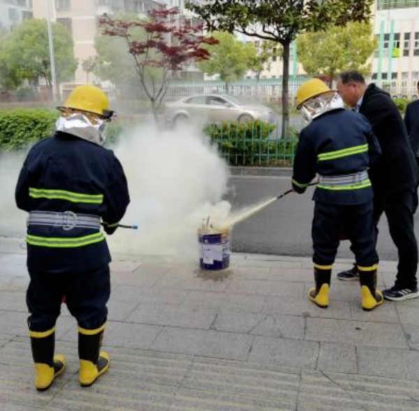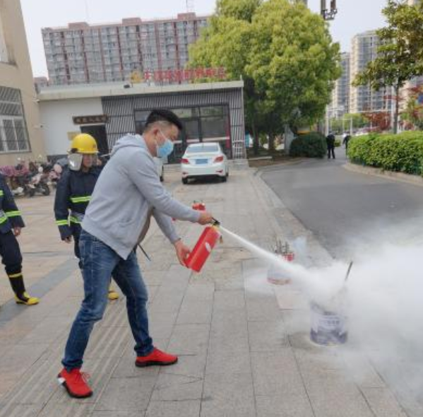 隨后,現(xiàn)場物業(yè)消防人員和部分業(yè)主對滅火器的使用方法進(jìn)行了演示,他們提起滅火器瓶反復(fù)顛倒幾次、拔去鉛封和保險(xiǎn)銷、站在火焰上方位置左握噴管右提壓把,瞄準(zhǔn)火焰根部噴射。