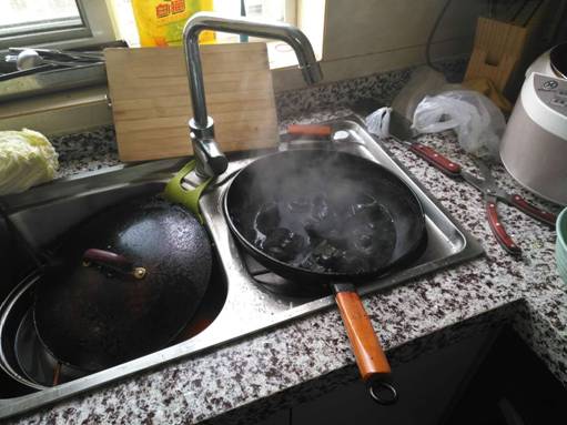 這時(shí)周圍鄰居也聞到了焦味,也許是擔(dān)心,大家都一同出來了。物業(yè)客服人員一邊聯(lián)系該室業(yè)主告知家中發(fā)生的事情,一邊緊急組織保安人員拿著滅火器,做好滅火的準(zhǔn)備。幸好805業(yè)主幾分鐘趕回來了,進(jìn)到廚房里發(fā)現(xiàn)灶鍋已被燒焦,里面的肉也已被燒成炭狀,不斷冒出黑煙。物業(yè)秩序維護(hù)人員立即把煤氣的大閥小閥關(guān)掉,把鍋端下放入水池中,然后把家里所有窗戶都打開,一起火災(zāi)隱患得以及時(shí)被消除。