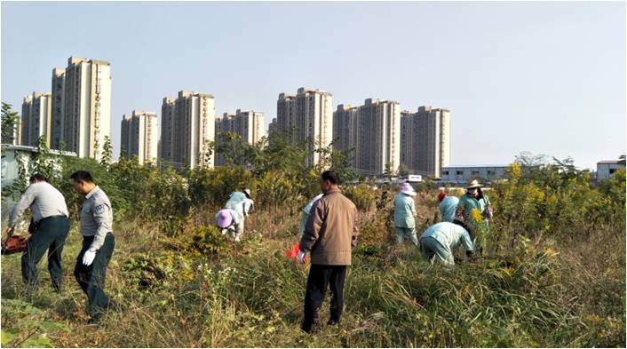 勢(shì)不容緩,下午兩點(diǎn)不到,項(xiàng)目部所有保潔、保安人員帶著鏟鍬、鐮刀等作業(yè)工具來(lái)到現(xiàn)場(chǎng)。在項(xiàng)目負(fù)責(zé)人的簡(jiǎn)單安排下,大家立即投入到了鏟除工作中。大家手拿鐮刀、鐵鍬對(duì)轄區(qū)內(nèi)成片的“一枝黃花”進(jìn)行集中鏟除,發(fā)現(xiàn)一株就用鐮刀割、用鐵鍬挖,盡力破壞其根系,從根本上鏟除“一枝黃花”對(duì)其它植物生長(zhǎng)的危害。人多力量大,不一會(huì)兒,區(qū)域內(nèi)成片的“一枝黃花”紛紛倒在了腳下。大家又把砍倒的“一枝黃花”搬運(yùn)到廢棄的房子里,杜絕其種子隨風(fēng)傳播,造成來(lái)年再泛濫成災(zāi)。