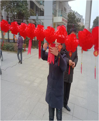 2月14日上午,文昌花園物業(yè)經理助理劉桂琴與工程范錄江、華永道和朱洪三人帶上人字梯、鐵絲、紅燈籠、訂書機、字謎提前布置好元宵節(jié)現場。下午兩點后,許多居民陸陸續(xù)續(xù)從家中走出,攜親伴友來小區(qū)中心廣場參加猜燈謎活動。猜燈謎、扎花燈、面塑、糖人,也吸引了朱自清小學的學生們。