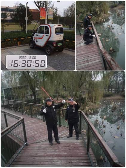 值日負(fù)責(zé)人朱有順和金海山獲悉信息后,第一時(shí)間趕到了現(xiàn)場(chǎng),經(jīng)估測(cè)河水有1.3米深,當(dāng)前時(shí)節(jié)沒有合適工具打撈難度較大;天色漸晚,為了確保安全只好勸老人將電動(dòng)車暫時(shí)停放園區(qū),由人才公園萬(wàn)楊物業(yè)晚班保安看護(hù),勸老人先回家約好第二天幫他將鑰匙打撈上來(lái),徐禮成老人和朋友都將信將疑地回家了……