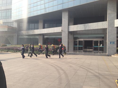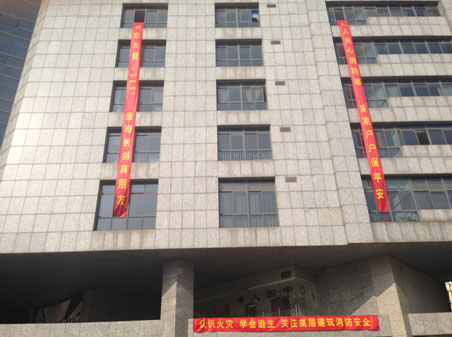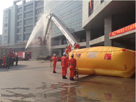 九點(diǎn)整,所有參加演習(xí)的消防官兵方正、公司安保隊(duì)員及管理人員方正、參與演習(xí)被困人員方正全部整齊列隊(duì),等待總指揮一聲令下,全都井然有序的各就各位,開(kāi)始了正式演習(xí)。501室的窗口濃煙直冒,消防車及時(shí)趕到樓下,一輛車開(kāi)始對(duì)幕墻噴淋,一輛高空救援車停在了窗下,我們的救援車將消防員送達(dá)到五樓,將被困人員安全的救了下來(lái),還有一部份人員在其他消防員的引導(dǎo)下從安全通道有序的逃生成功。