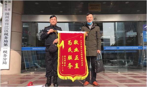 2020年12月11日上午,一位中年男子走進(jìn)邗江稅務(wù)局門(mén)崗內(nèi),手中托著一面錦旗,錦旗上寫(xiě)著“敬業(yè)正直 為民服務(wù)”八大打字。