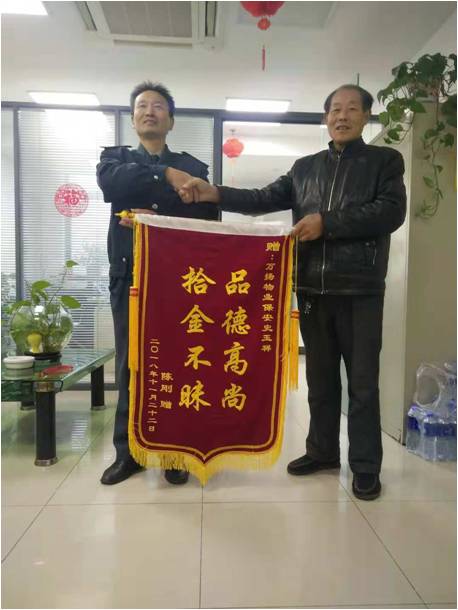 2018年11月22日下午2:10左右,有一位中年男子肩挎一個背包走進了邗江區(qū)維揚路邗江稅務局第一稅務分局,取號辦理業(yè)務,2:20匆匆離開。該項目秩序維護員史玉祥,在稅務大廳像平常一樣巡視時,抬頭發(fā)現柜臺上面有一個黑色錢包,環(huán)顧整個大廳,沒有一個辦事人員,等待了十幾分鐘后,沒有等來尋找錢包的人,史玉祥立即慎重其事,把這一情況立即匯報給了江蘇萬楊物業(yè)公司安保負責人,同時也上報了稅務局領導,稅務局領導隨即派人與史玉祥一起打開錢包,發(fā)現百元現金若干張、銀行卡八張?紤]到失主丟失財物后定是萬分焦急,稅務局領導立即調取大廳監(jiān)控,在初步確認失主后,立即通過多方尋找聯(lián)系,終于聯(lián)系上了失主,失主是寶應人,在辦理業(yè)務過程中因證件不全加上有急事辦理,匆忙離開中將錢包忘拿了。得知錢包下落的陳失主心情特別激動,要重謝史玉祥,被他婉言拒絕了。失主知道了史玉祥工作單位是江蘇萬楊物業(yè)公司,立即定制了一面錦旗送到了萬楊物業(yè)公司企業(yè)服務部,當面感謝史玉祥拾金不昧的行為。史玉祥同志拾金不昧的高尚品質和高度負責的工作態(tài)度贏得了客戶的高度贊賞,也為萬楊物業(yè)管理服務公司贏得了良好的社會聲譽。