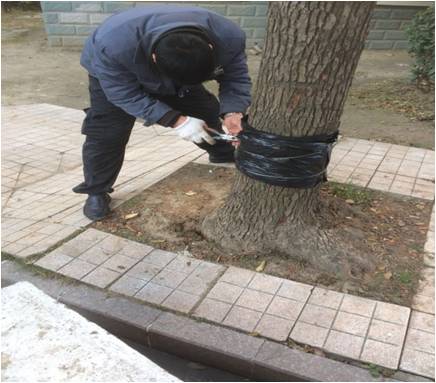 好好的樹怎么就受傷了呢?工程師傅來不及細想,先保護香樟樹要緊。于是大家立即行動起來,買來保溫材料,在樹的根部,分二層進行包裹,先將樹干用濕泥巴涂抹起來,對其起到保濕作用,再用薄膜包裹起來,希望通過這樣的保護方式可以讓這棵香樟樹溫暖過冬。