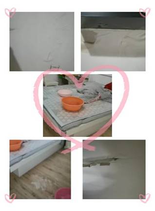 到了10樓,發(fā)現(xiàn)業(yè)主家的客廳墻面自上而下已全部脫皮,而且最下方一條水柱還在噴射著,主臥室頂?shù)挠推嵋呀?jīng)脫落,床上、地上放著多個(gè)盆在接水,女業(yè)主著急的說,他們只是下午出去有事的,沒想到回到家變成了這個(gè)慘狀。